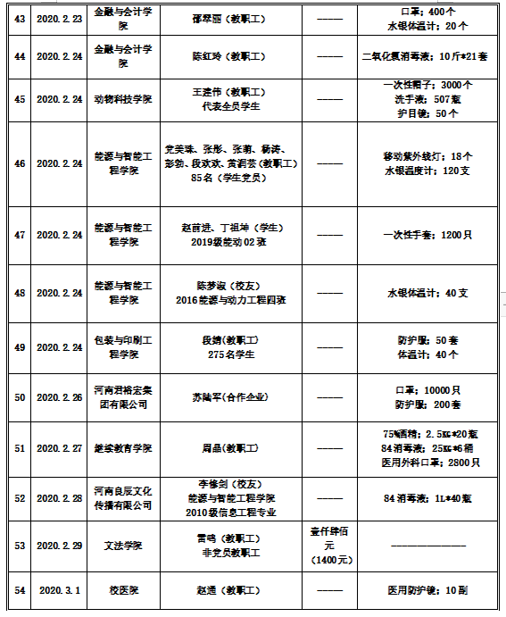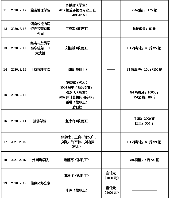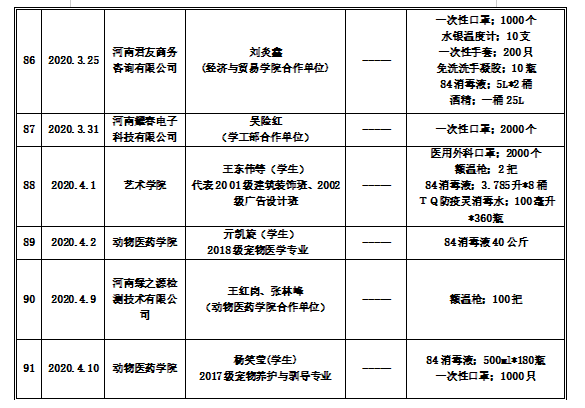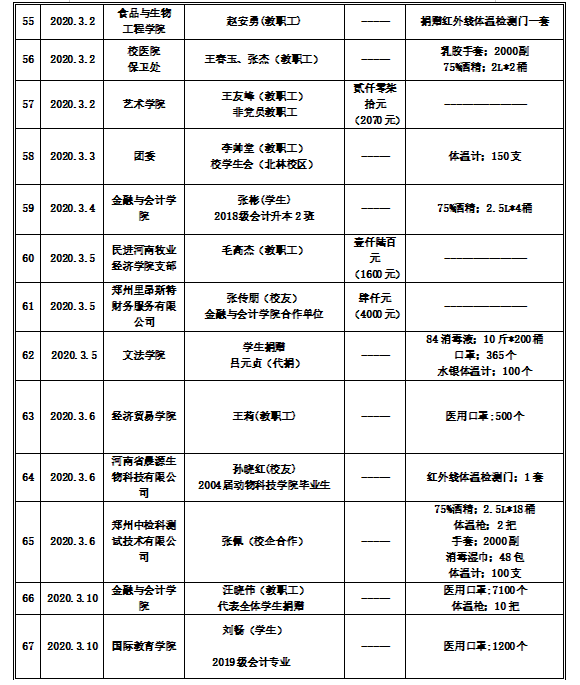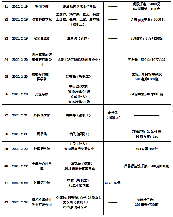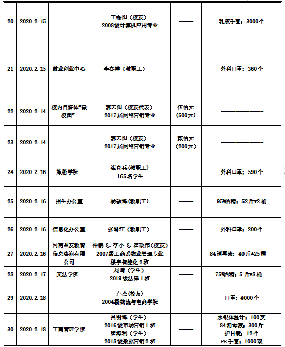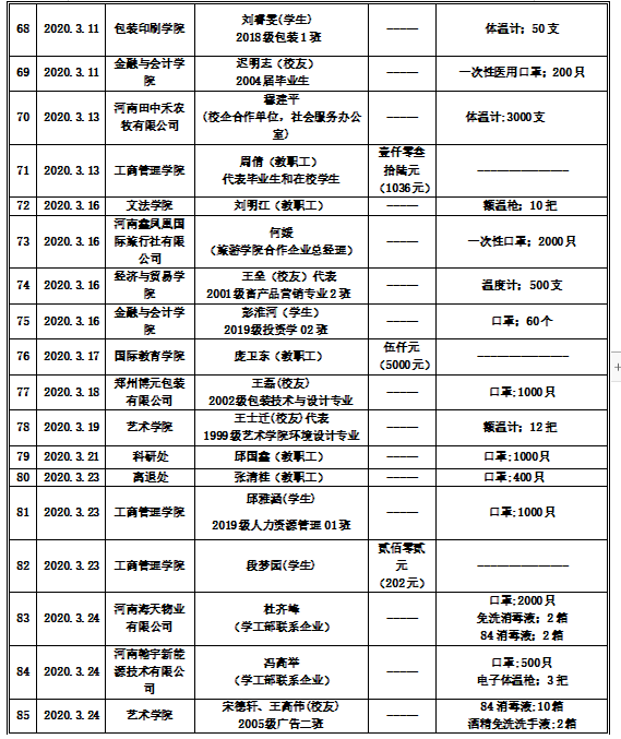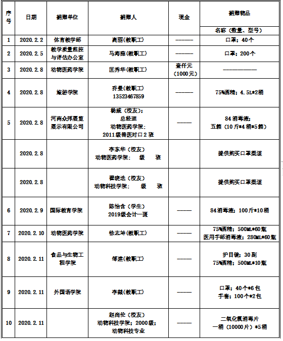 疫情无情人有情,共克时艰传真情。自学校疫情防控工作领导小组通过校友会和学校各部门领导的广泛宣传之下;广大校友、全体师生及亲友和社会各界人士、纷纷捐款、捐物竭尽所能提供各种防护物资、聚沙成塔,截至到4月9日截至目前累计收到爱心捐赠89笔,累计金额壹万肆仟玖佰柒拾贰元整(14972元)、酒精748.5升、含氯消毒液4653.36升、含氯消毒片 50000片、普通洗手液657瓶、一次性手套21800只、手持式红外测温仪 139把、护目镜152副,一次性医用口罩50955个,测温门2套、玻璃体温计4230个及其它物品。