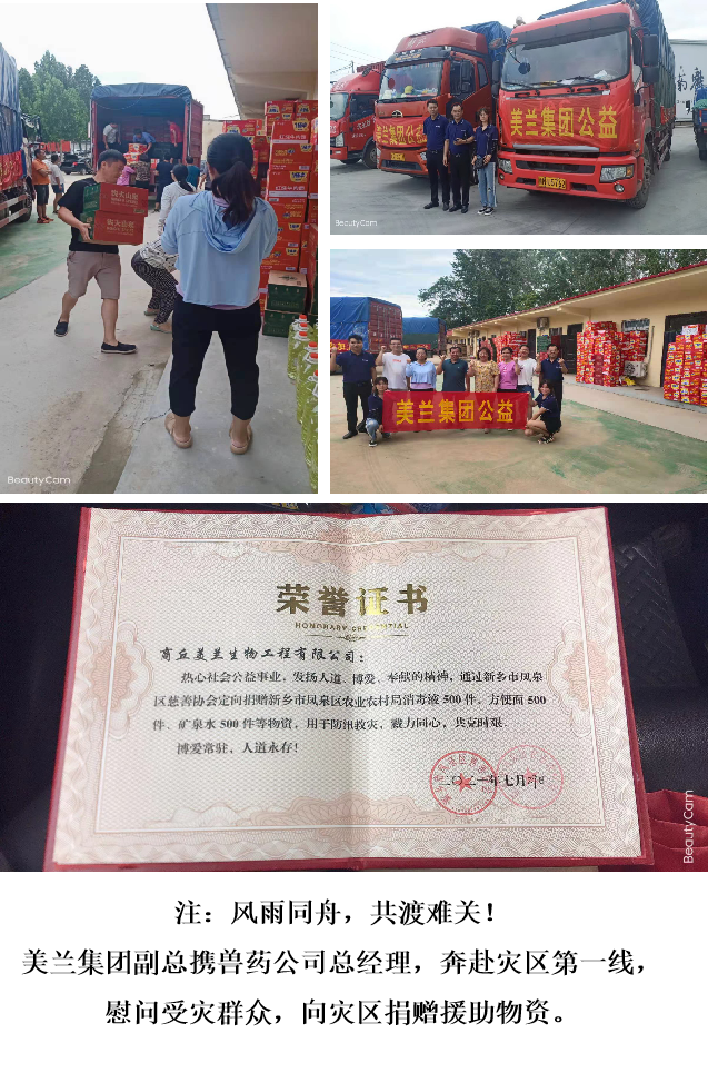 2021年7月28日,美兰生物又再次协调公司各部门采购日常生活物资和消毒剂,冒着大雨组织工人对筹集的物资进行装运。物资抵达受灾地区后,集团第一时间安排工作人员与新乡市凤泉区慈善协会联系和沟通,定向捐赠新乡市凤泉区农业农村局消毒液500件,农夫山泉矿泉水500箱,方便面500箱等生活物资。