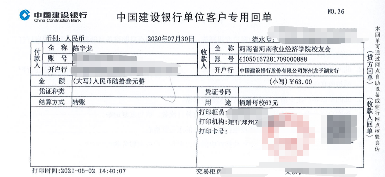 2020年“我爱母校”捐赠 | 陈宇龙捐款63元
