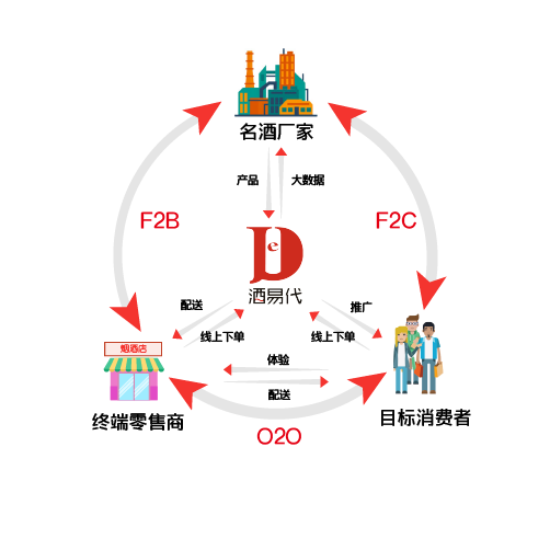建立厂商/品牌商到终端,终端到消费者的F2B2C电商平台,减少酒类流通渠道的中间环节,省去不必要的一级经销商、二级经销商等中间渠道,建立直控终端,直接面向消费者,降低酒类流通成本。