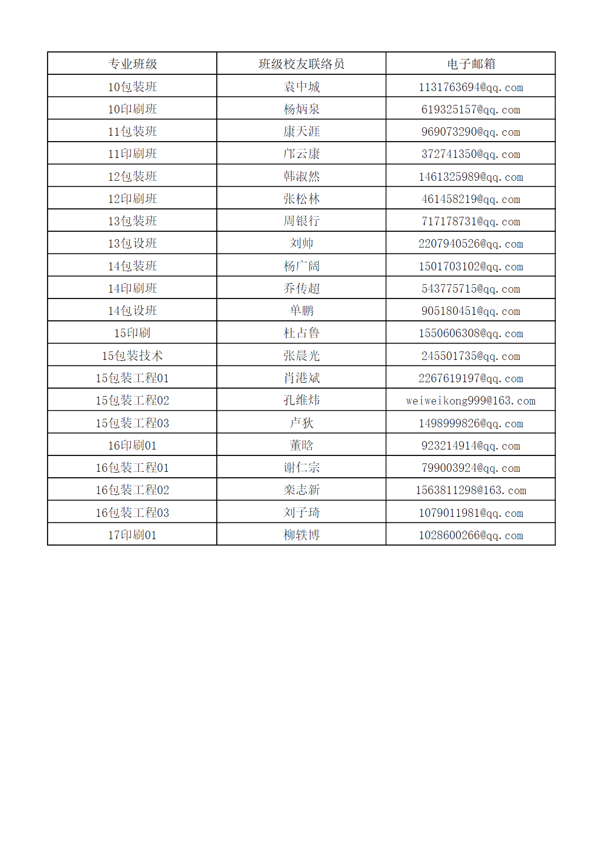 包装与印刷工程学院2010级-2017级班级校友联络员